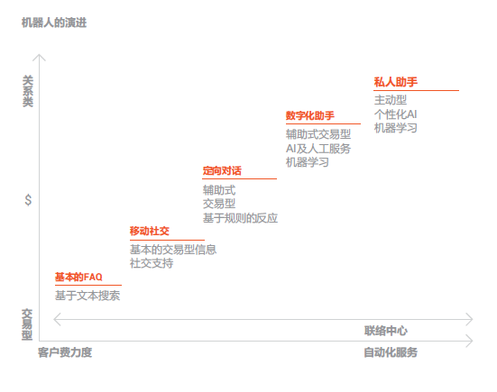 客戶服務(wù)智能化: 就是通過對(duì)服務(wù)流程的優(yōu)化或改造以支撐AI技術(shù)應(yīng)用最終達(dá)到提升人工效率和客戶體驗(yàn)的過程。在用戶層面包括:語音或文本聊天機(jī)器人、實(shí)體機(jī)器人、虛擬座席、智能IVR 、智能外呼等。在座席層面包括:智能知識(shí)庫、智能工單系統(tǒng)、智能營(yíng)銷輔助系統(tǒng)、流程機(jī)器人、座席學(xué)習(xí)系統(tǒng)、座席情緒感知系統(tǒng)等。在管理層面包括:智能質(zhì)檢系統(tǒng)、智監(jiān)控系統(tǒng)、智能 分析系統(tǒng)、智能排班系統(tǒng)等。