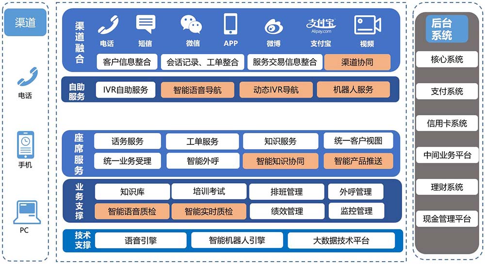 靈云全智能客服系統(tǒng)應(yīng)用語音識(shí)別、語音合成、語義理解等人工智能技術(shù),通過擬人化的語音、文字等方式與客戶進(jìn)行自然流暢的交互,從而提供自主在線問答、咨詢、業(yè)務(wù)辦理等服務(wù)?膳c業(yè)務(wù)系統(tǒng)對(duì)接,通過電話、網(wǎng)頁、微信以及實(shí)體機(jī)器人等多種渠道服務(wù)于廣大用戶,大幅度降低客服成本,提升服務(wù)效率和用戶滿意度。